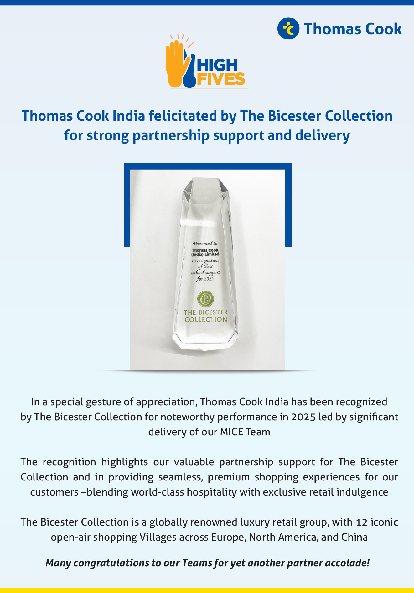 The Bicester Collection Felicitates Thomas Cook for Strong Partnership Support and Delivery